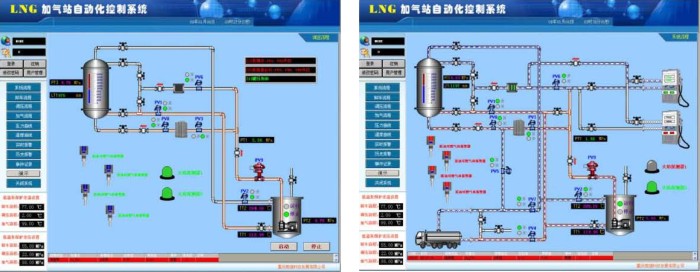 LNG(液化天然气站)管理系统包括传感器、传感器、电磁阀、PLC柜、警报和工业计算机,等等。 主要功能:监视和管理对液化天然气储罐、低温泵、工艺阀门和加气机。 自动开关和控制操作卸货,调整压力,气体填充。数据收集、查询、存储和打印报告形式。 LNG管理系统界面: